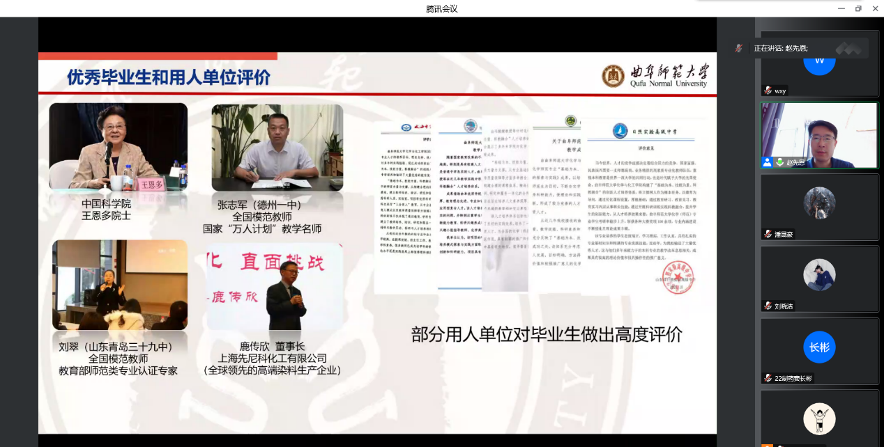 取得的一系列成就,通过展示教育实习基地签约情况、部分学生获奖证书,课题组研究成果等,鼓励新生向优秀校友看齐,努力学习专业知识,逐步实现自己的人生价值。最后,各专业老师结合优秀毕业生和用人单位评价,分析了专业就业前景及发展方向,针对评论区中学生的疑问进行了解答,鼓励同学们参与竞赛,开拓视野。