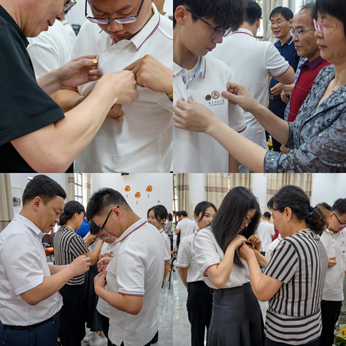 图为老师们为学生佩戴校徽
