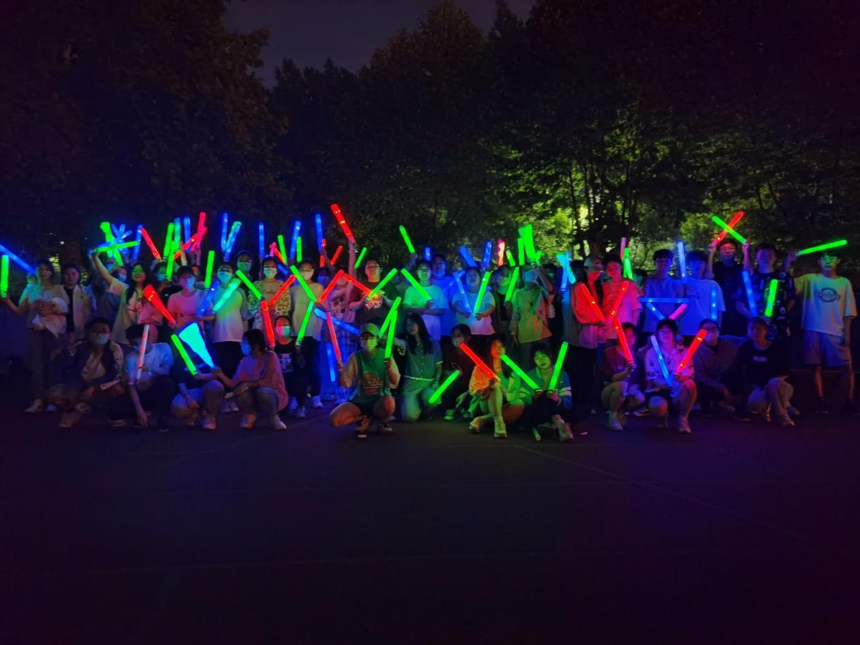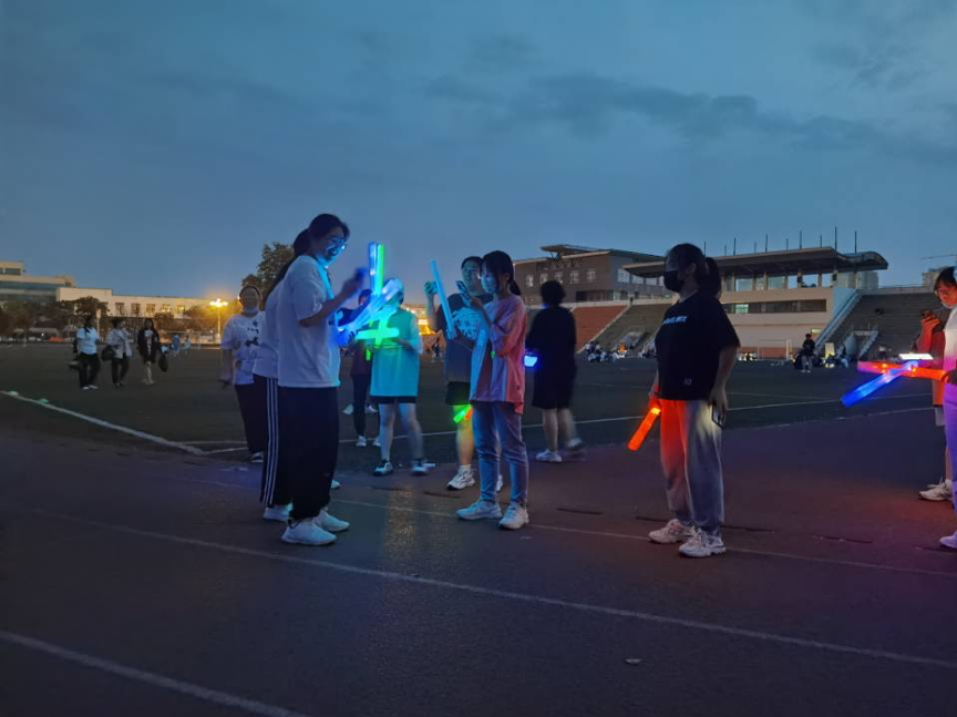活动开始前,心理健康服务部部长袁菲向参加本次活动的同学们介绍活动的流程及规则。本次活动,每回合共四组队伍参与,共进行三个回合,每个回合每组队伍占据一条跑道。活动开始后,先由每组的两名同学手握荧光棒跑一圈, 完成第一环节“你演我猜”的游戏。接着由另外两名同学进行接力,跑步一圈之后,完成第二环节“猜字谜”。最后,由队伍中剩余的同学完成最终的接力。活动过程中,同学们手握着荧光棒,化身一只只小萤火虫,将整个操场装点成一个荧光闪耀的欢乐海洋,涌动的人群在跑道上形成了一道道亮丽的风景线,整个操场荧光闪闪,充满着欢呼与快乐。