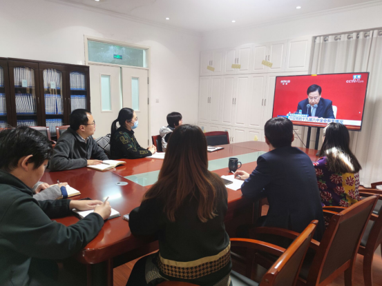 党委理论学习中心组成员集中观看十九届六中全会精神新闻发布会。