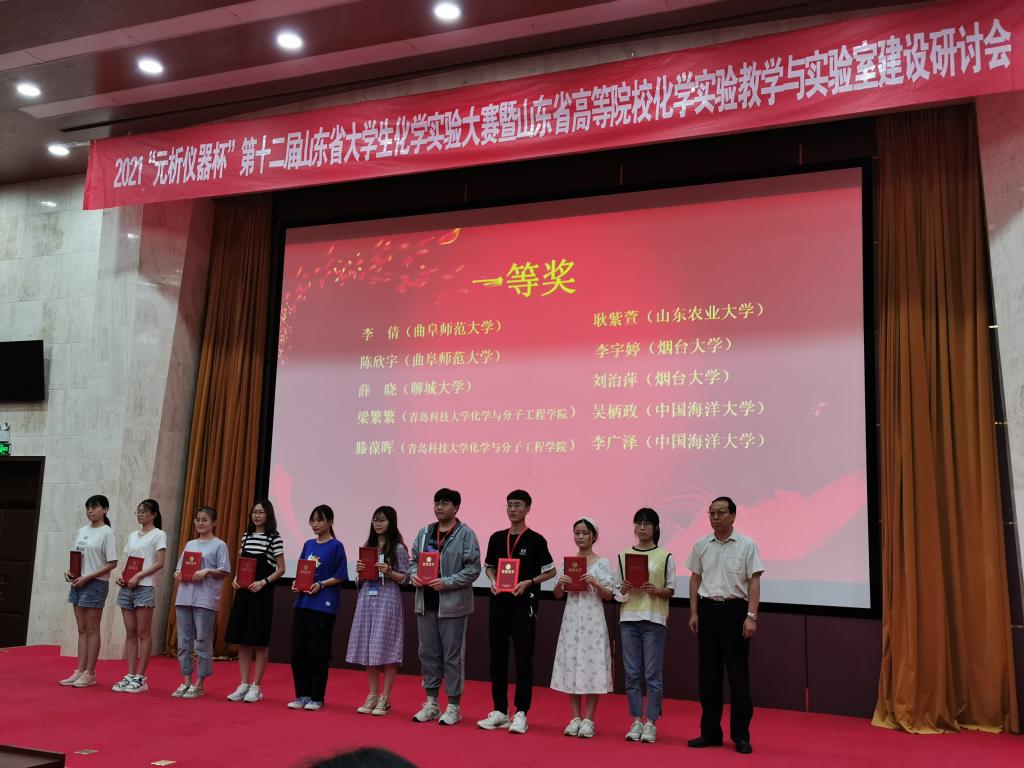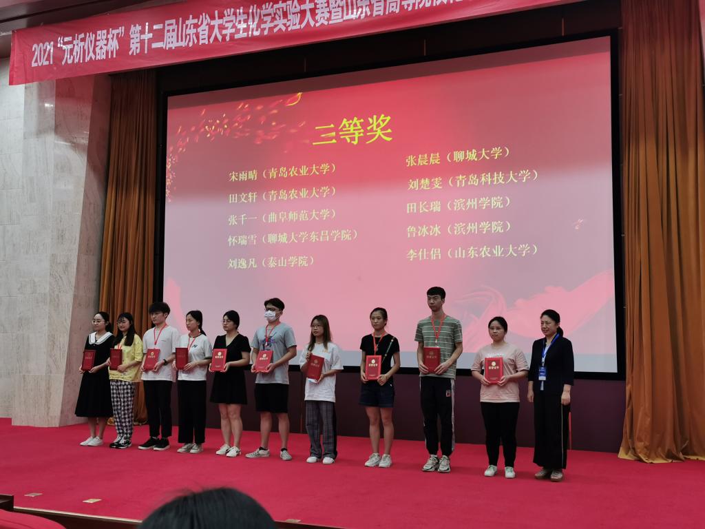 2021年7月19日至22日,“元析仪器杯”第十二届山东省大学生化学实验大赛在山东师范大学举行。代表曲阜师范大学参赛的三名选手在本届大赛中再获佳绩,李倩、陈欣宇同学获大赛一等奖;张千一同学获大赛二等奖。