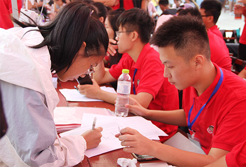 的迎新活动接近尾声,工作人员各司其职,密切配合,志愿者们热情服务,积极解答新生及家长的问题困惑,迎新工作有条不紊地进行着。