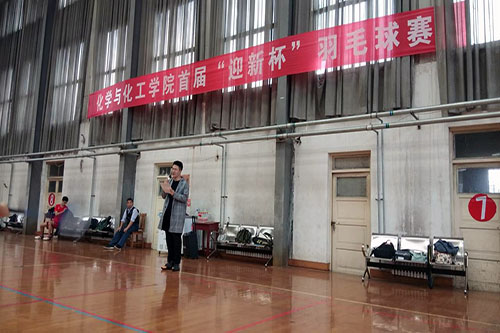 首届“迎新杯”羽毛球赛于西操场工体馆举行。