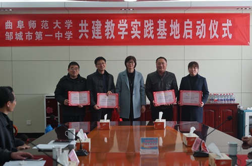 北京赛车教学院长冯媛媛老师向邹城一中陈波、林东、周青、刘鹏飞四位化学教师颁发了“曲师大教学实践指导教师”聘书,曲师大七位化学专业实习生随后入级部备课组进行实习授课。
