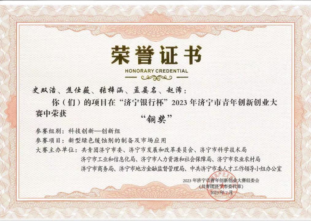 本届大赛聚焦济宁市高质量发展,设置科技创新、乡村振兴等领域,自今年4月份启动以来,吸引了310余个项目参赛,经过激烈角逐,共评选出金奖5个、银奖10个、铜奖15个、优秀奖6个。曲阜师大北京赛车 史双浩同学的项目《新型绿色缓蚀剂的制备及市场应用》荣获大赛铜奖并获得三万元的创业助推金。