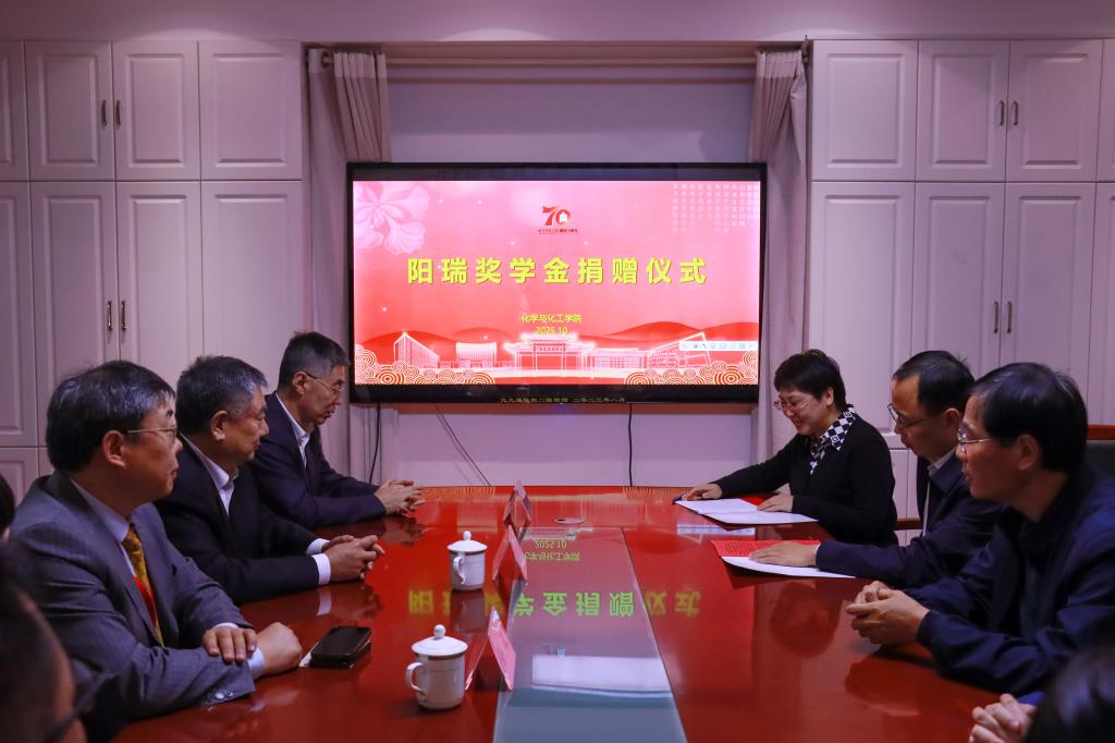 在学院209会议室隆重举行阳瑞奖学金捐赠仪式。阳瑞奖学金捐赠人、学院1992级校友孙波,学院校友会会长郁章玉,学校资产处副处长、原学院辅导员陈东方,学院党委书记赵琪,院长冯媛媛,党委副书记孙金玲,副院长李平、刘鹏,团委书记王亚平,辅导员梁梦琦出席仪式。仪式由党委副书记孙金玲主持。